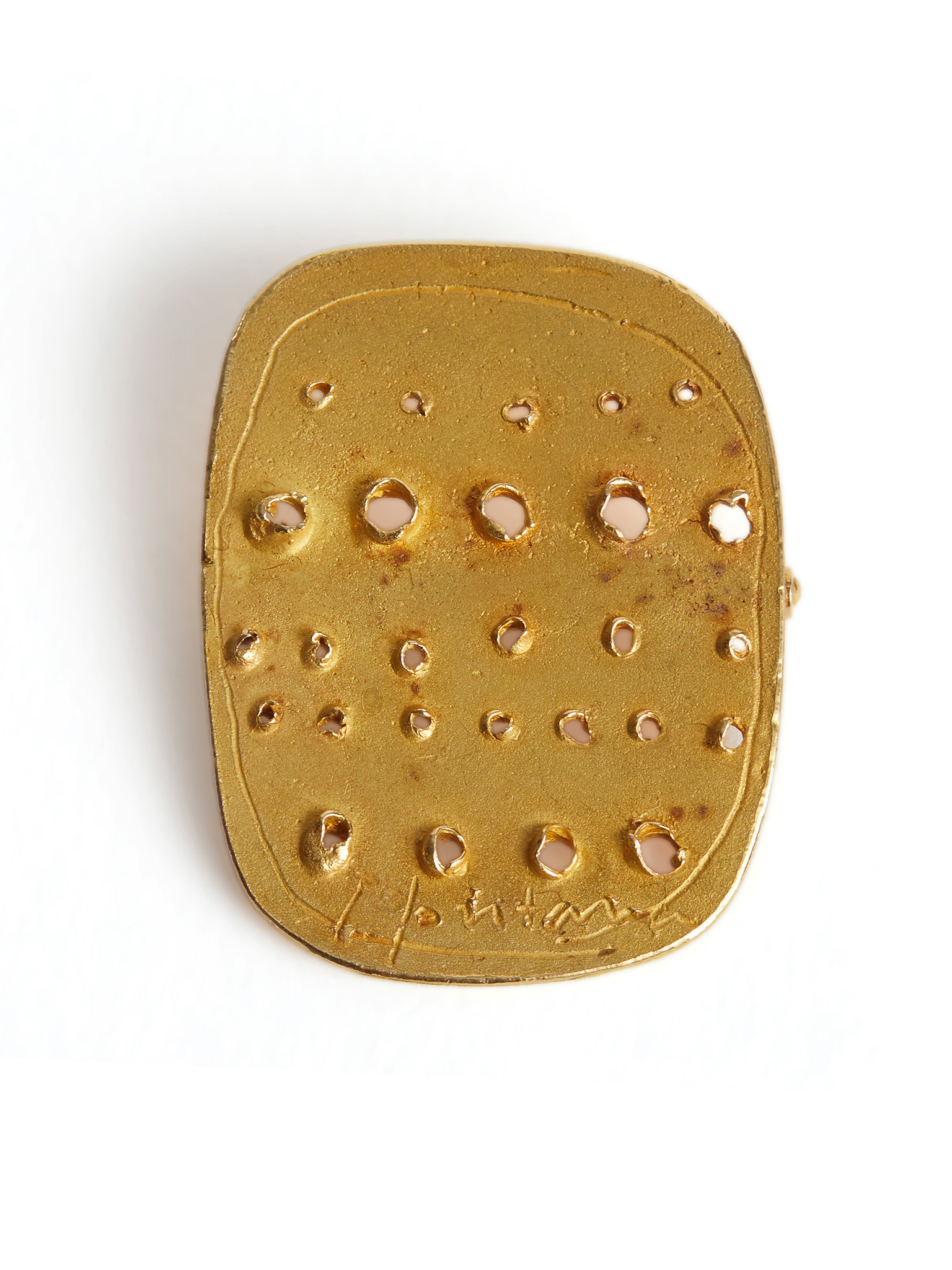 Lucio Fontana created his first jewels in the studio of Arnaldo and Giò Pomodoro in Milan where he wold punch holes into previously prepared gold sheets with a rusty nail that he carried in his pocket. He also collaborated with the Pomodoro brothers on a small number of jewels that were shown in an exhibition of Italian artist jewellery held in Neiman Marcus, Dallas, in 1960 organised by Odyssia Skouraz of the Odyssia Gallery, Rome.